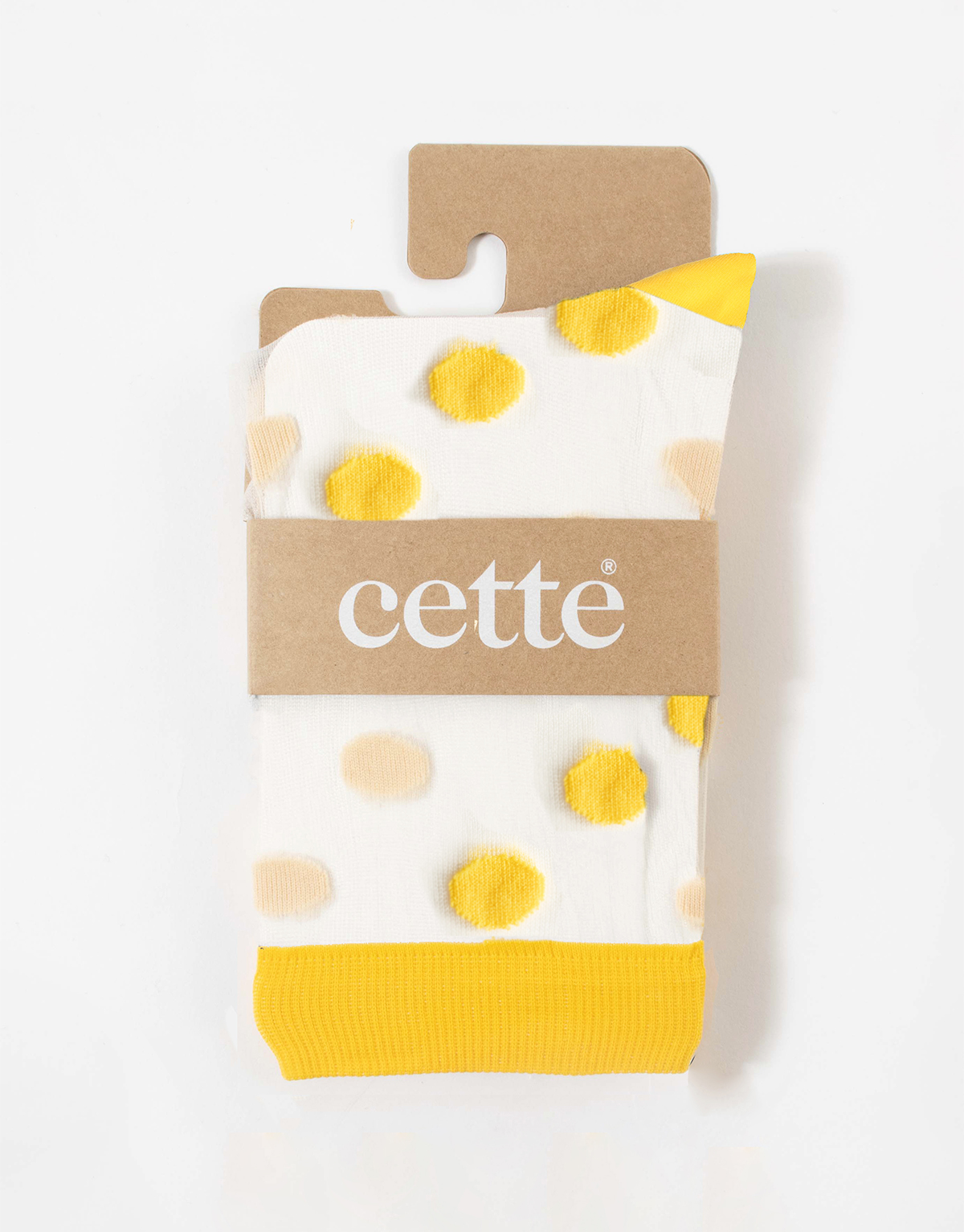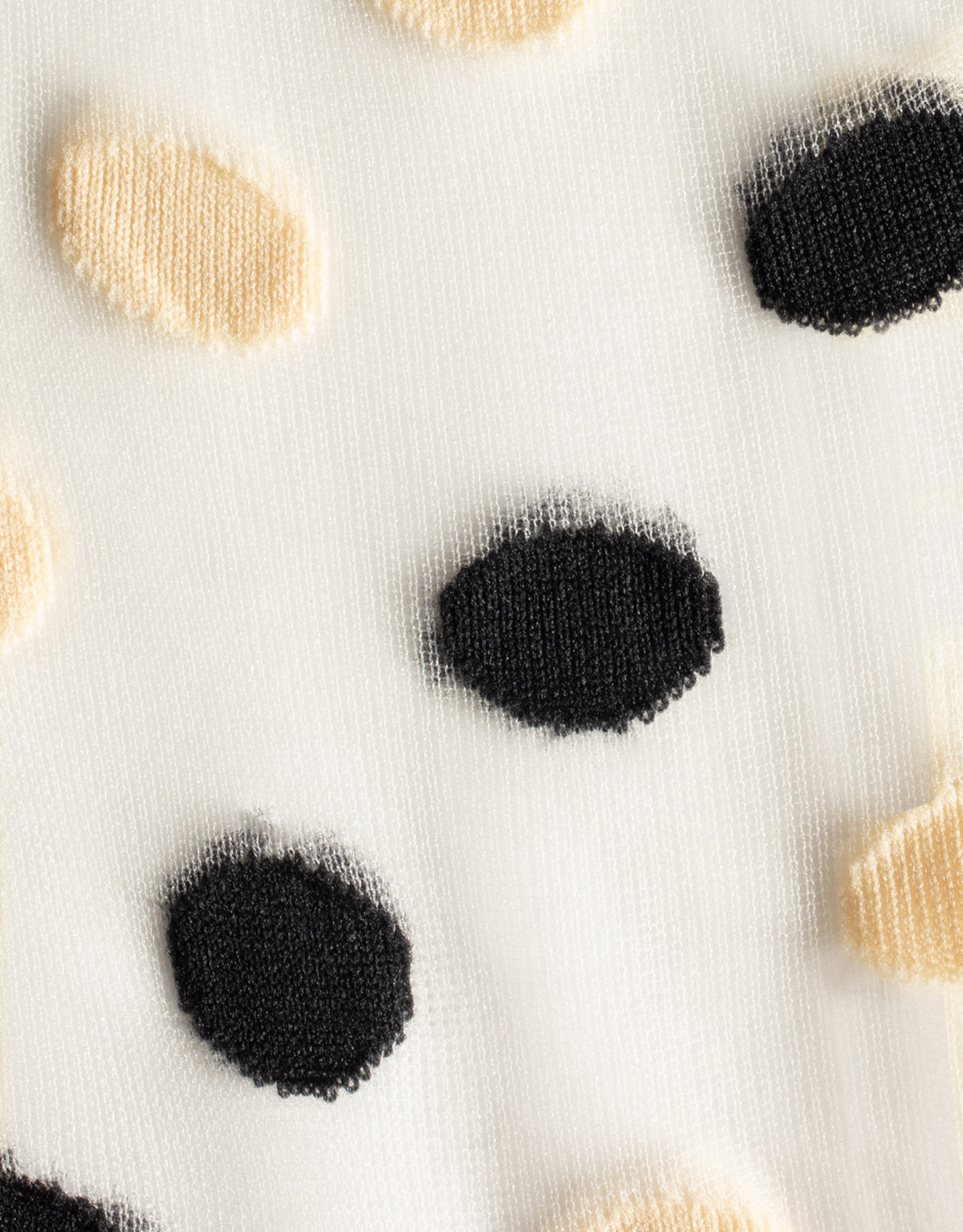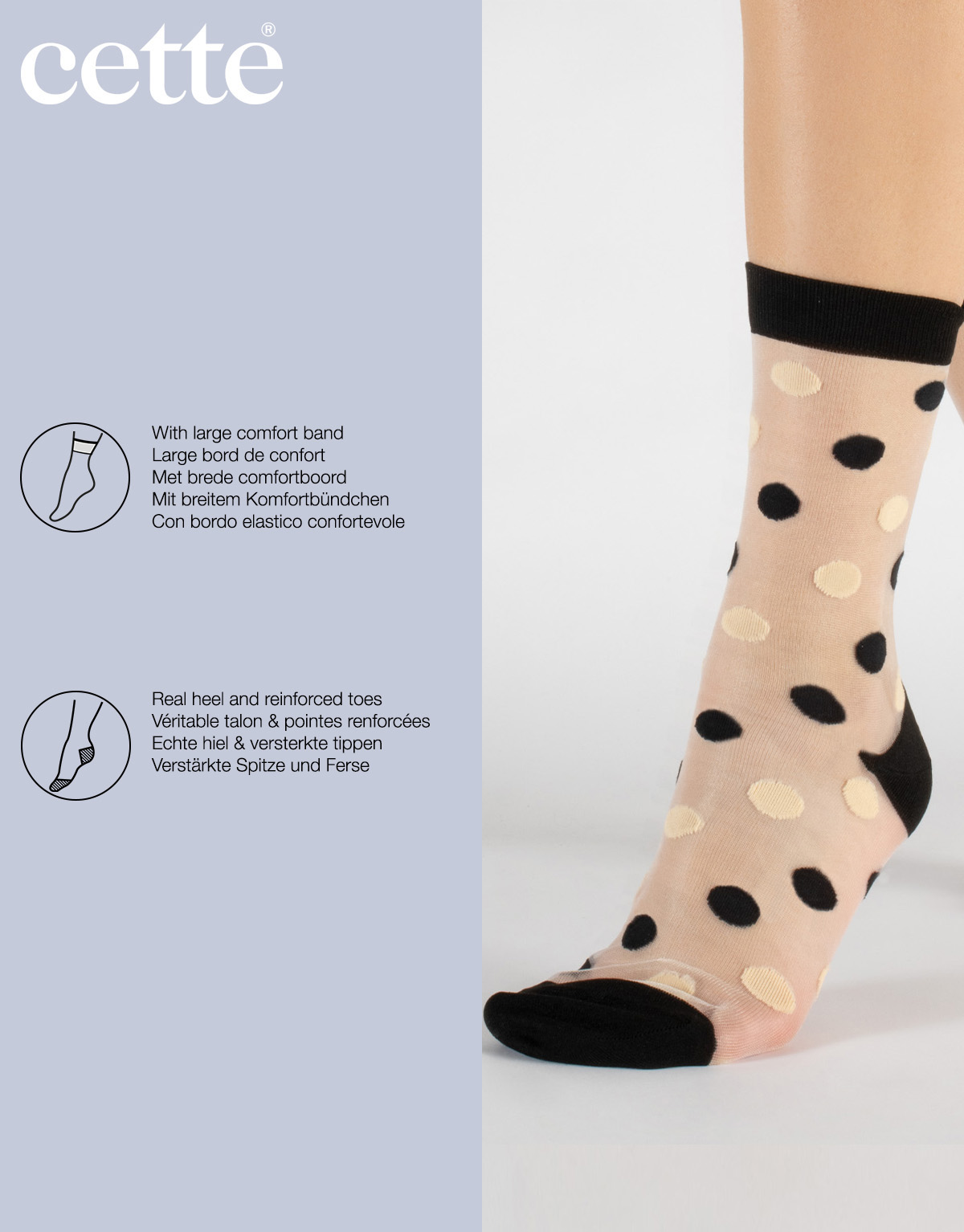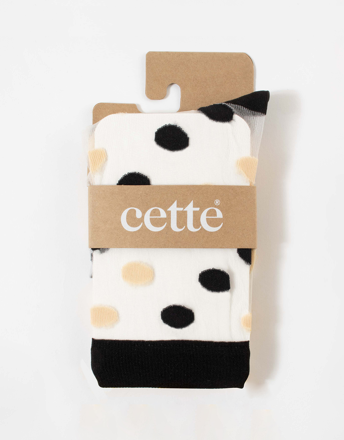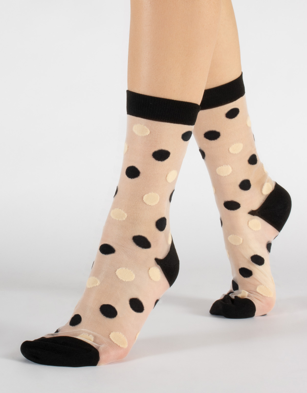 - Trendige Nylonsöckchen mit großen Tupfen in Creme/Schwarz oder Creme/Honig.