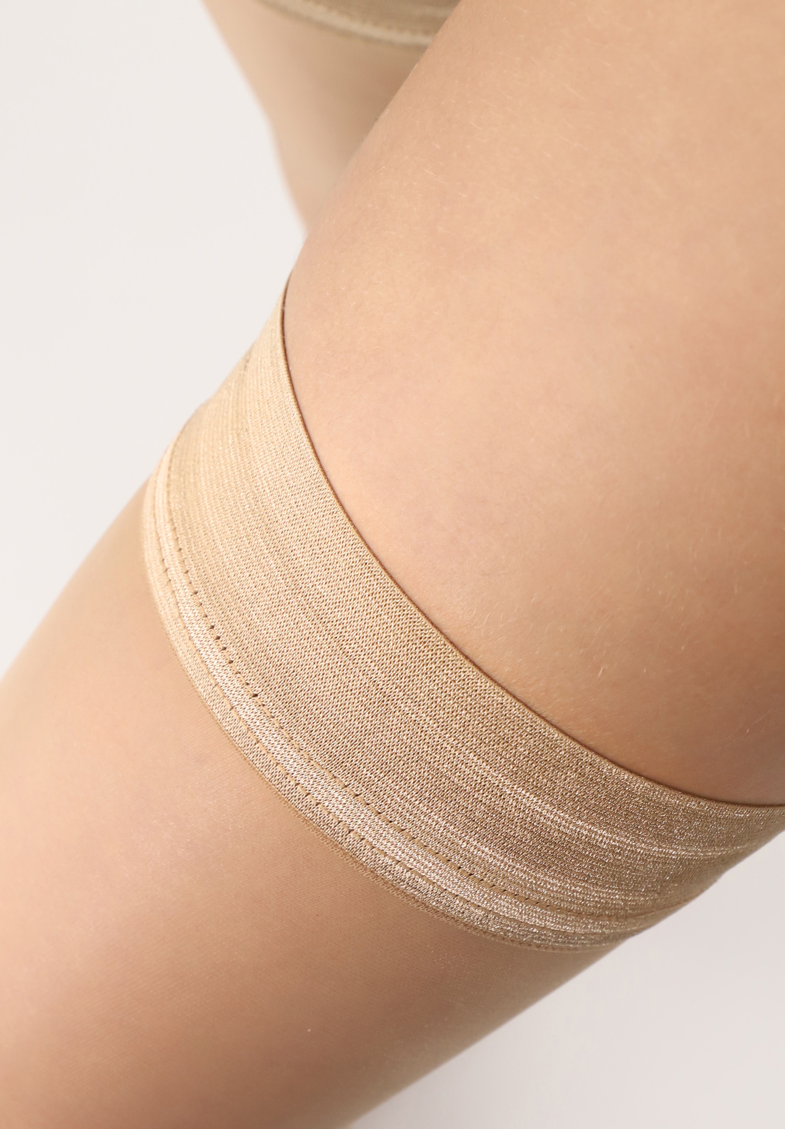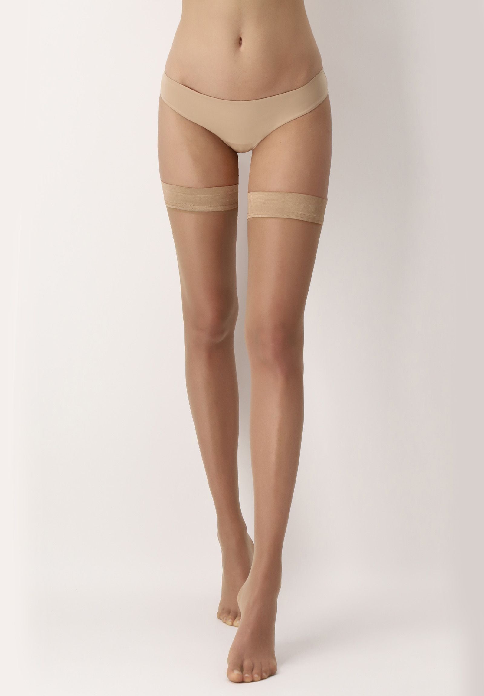 - Halterlose Sommerstrümpfe mit mattem Pudereffekt, die unsichtbar bleiben, da sie in 8 DEN hergestellt sind.
