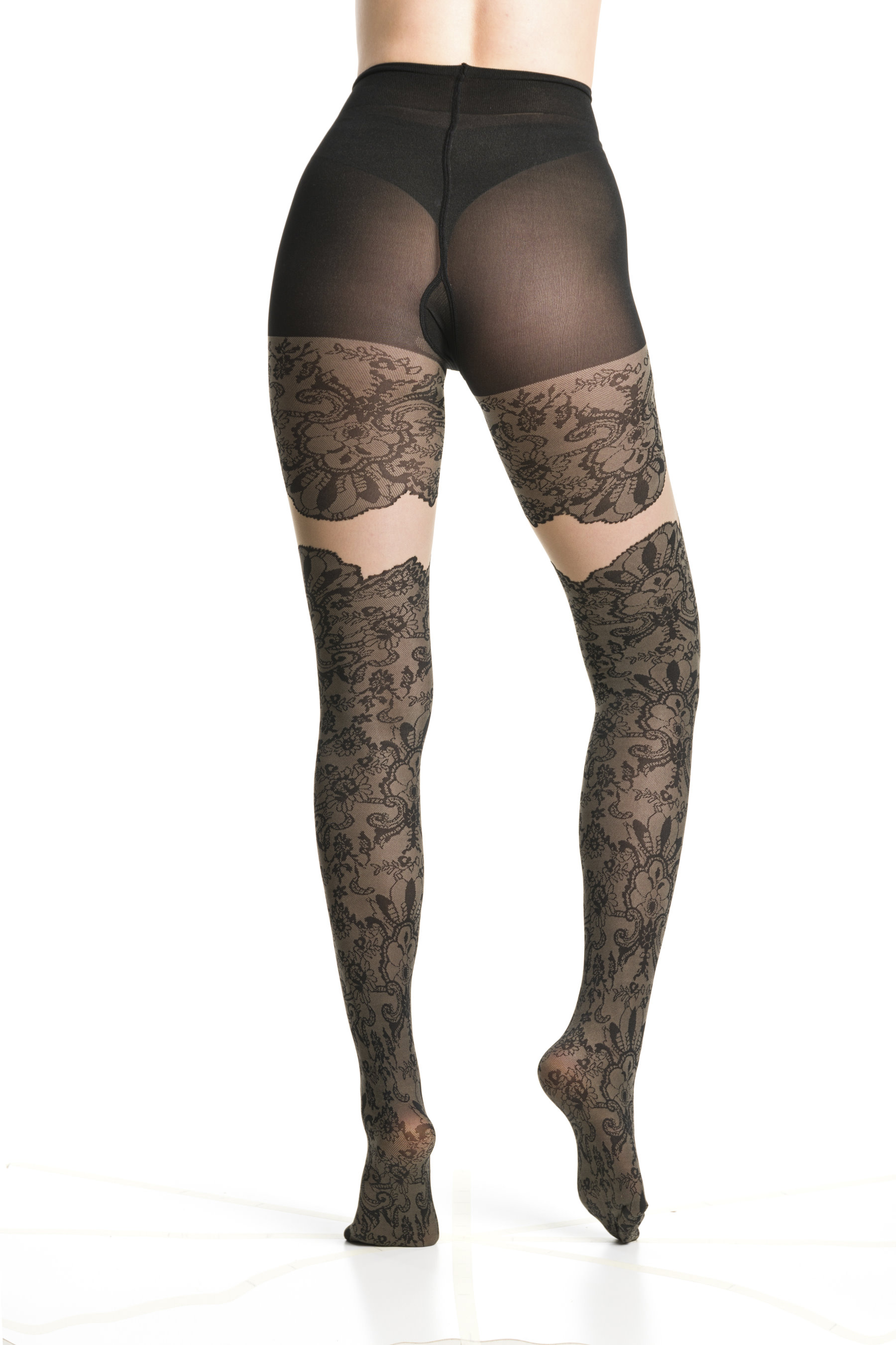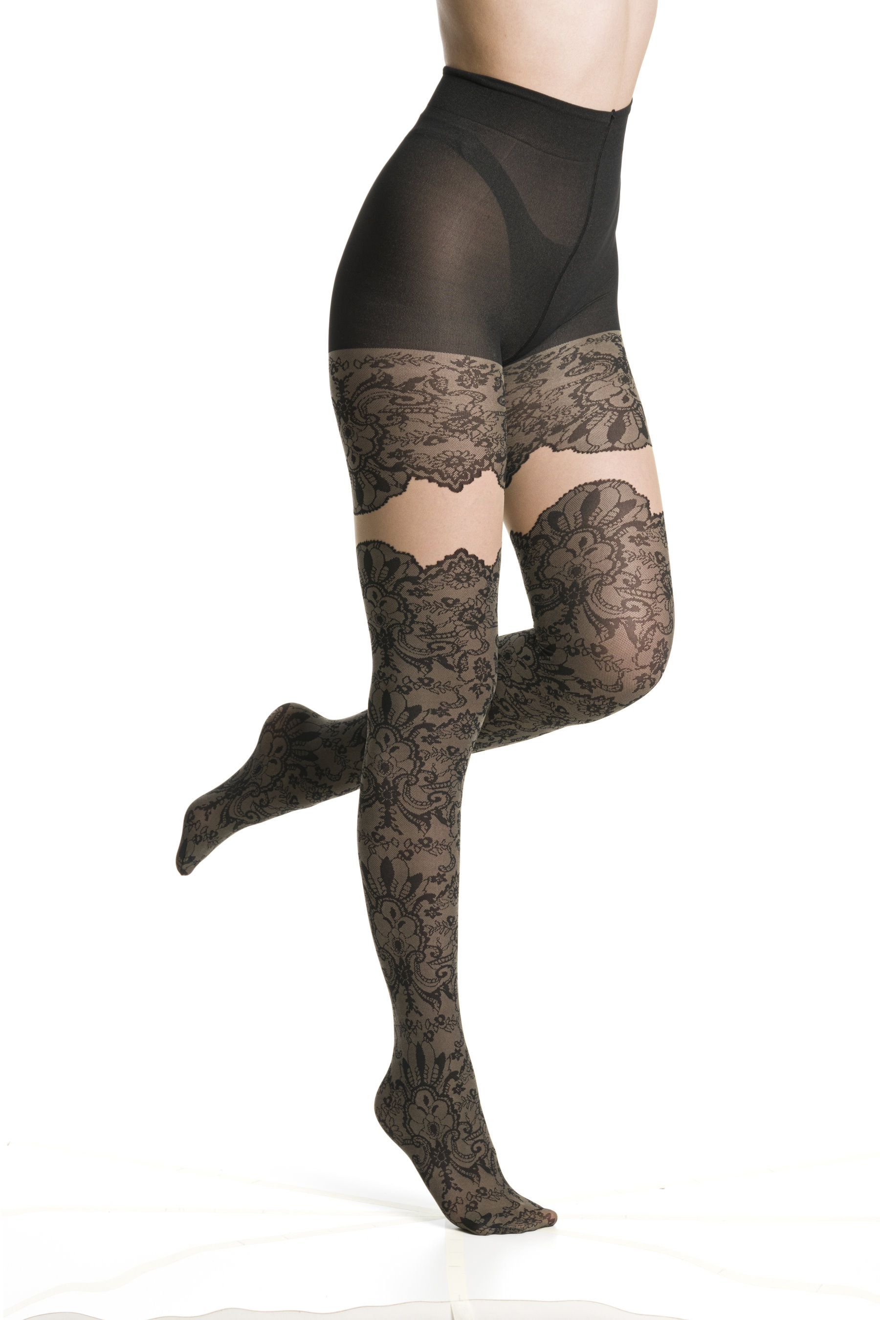 Collant sensuale finto autoreggente effetto pizzo con corpino effetto contenitivo. Elastico confort, cucitura 4 aghi piatta, articolo fissato con forma del piede, punta invisibile.