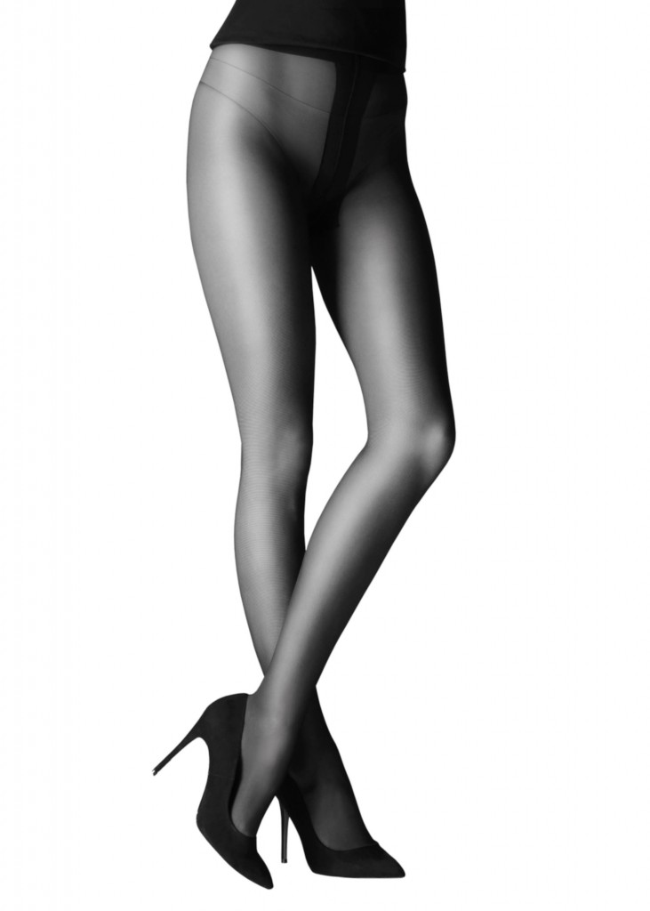 Glatte Feinstrumpfhose, glänzend, 15 DEN. Durchgehend transparent, mit leicht verstärkter Fußspitze, breitem Komfort-Taillenbund, handgefertigten flachen Nähten und atmungsaktivem Baumwollzwickel.